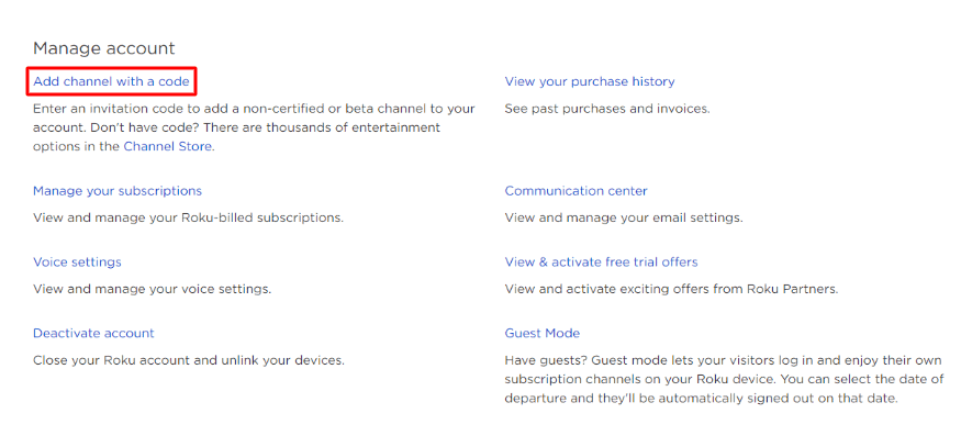 3. Once logged in, select Add channel with a code, under Manage account.