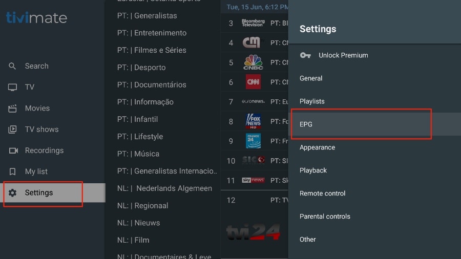 If you don’t see an EPG enabled in the TiviMate app, consider enabling it in the app’s Settings.